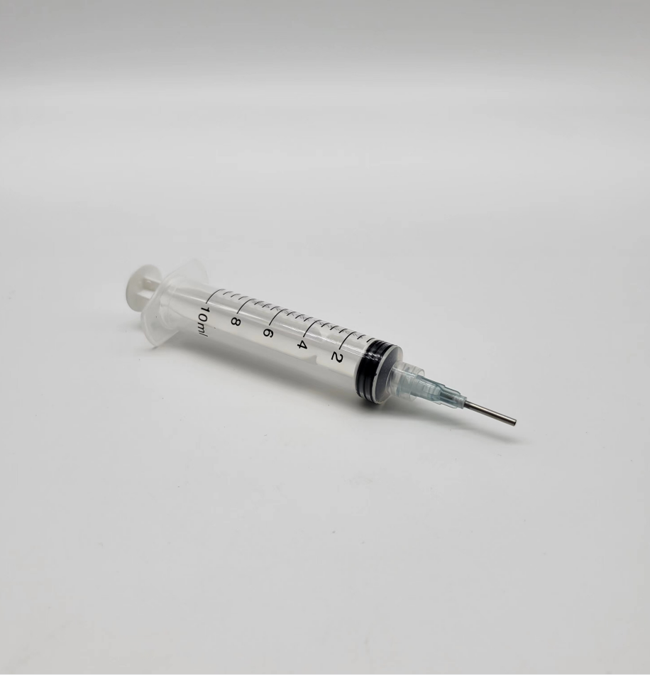 4、使用平口针注射器,依次从每一个电极头的小孔中注入适量的医用导电胶(注胶技巧:先将注射器插入电极头小孔,轻轻打圈转动,利用平口针拨开电极头下方压住的头发,再注入导电胶,方便导电胶有效接触到头皮);