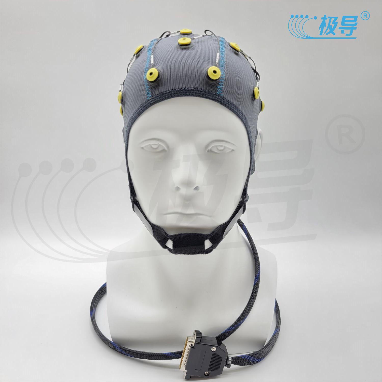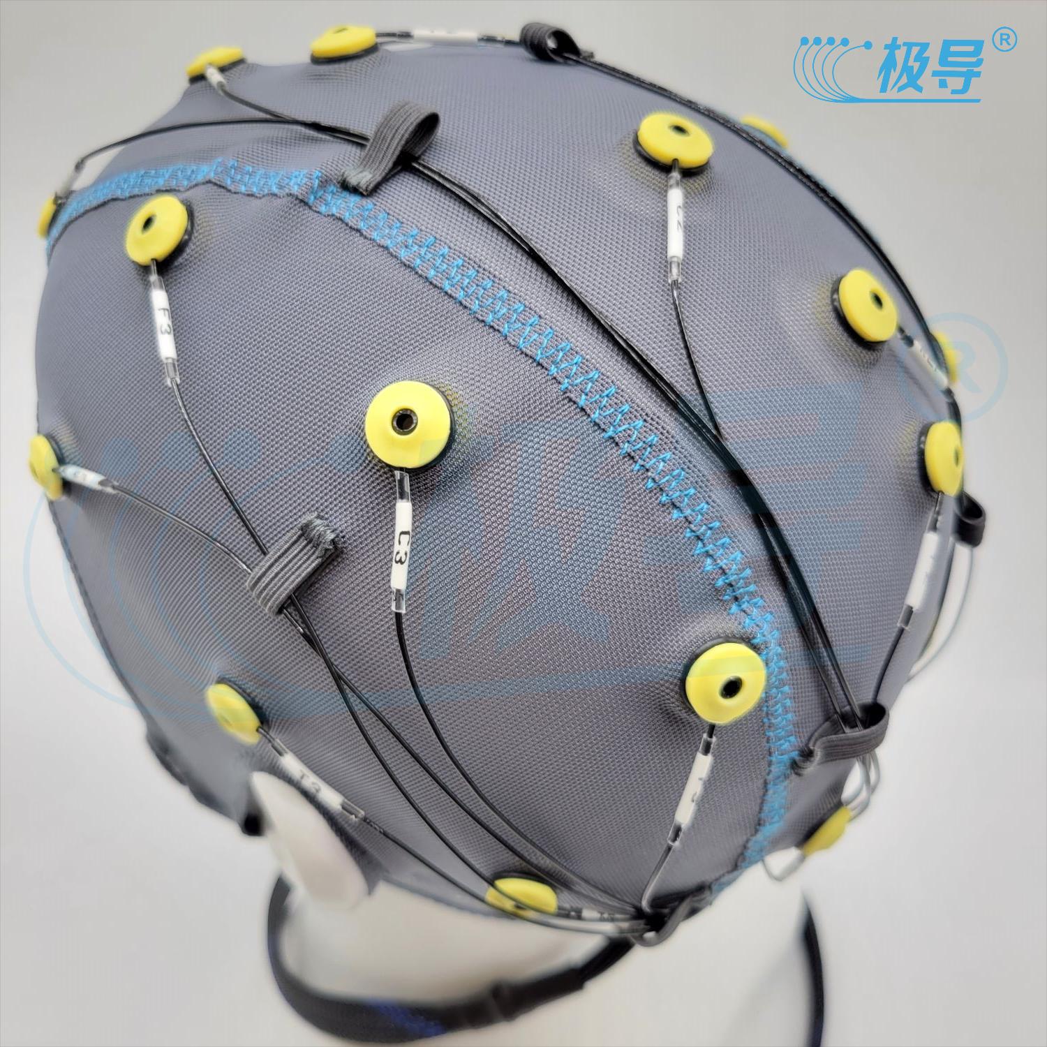 结构组成:弹力帽、脑电电极、镀银铜箔丝导线、不锈钢防水插头